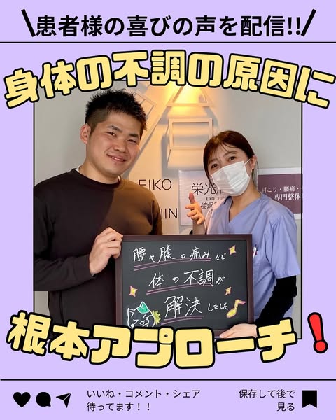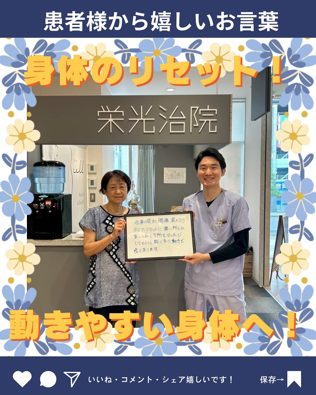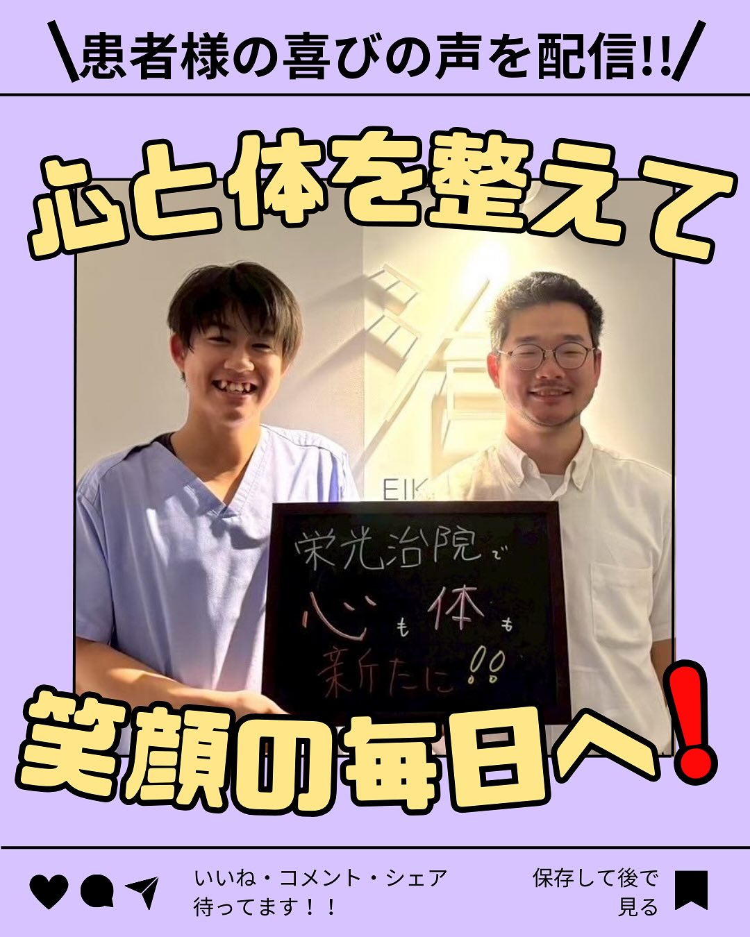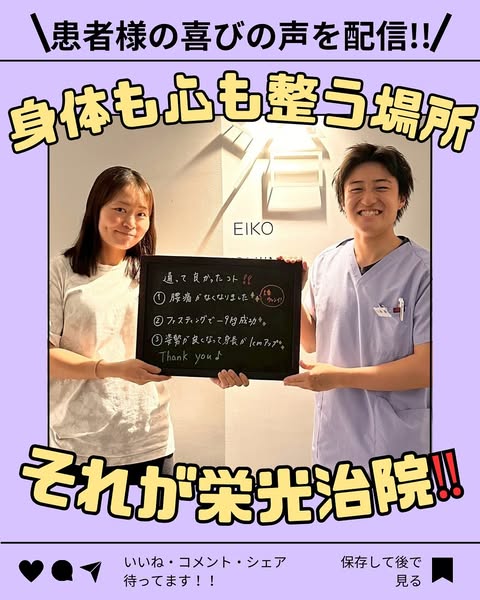 #栄光接骨院 #栄光治院 #腰痛 #肩こり #整体 #猫背矯正 #姿勢矯正 #骨盤矯正 #産後骨盤矯正 #姿勢改善 #鍼灸 #鍼 #自律神経 #眼精疲労 #頭痛 #美容鍼 #小顔矯正 #インナーマッスル #ファスティング #腸活 #ダイエット #体質改善