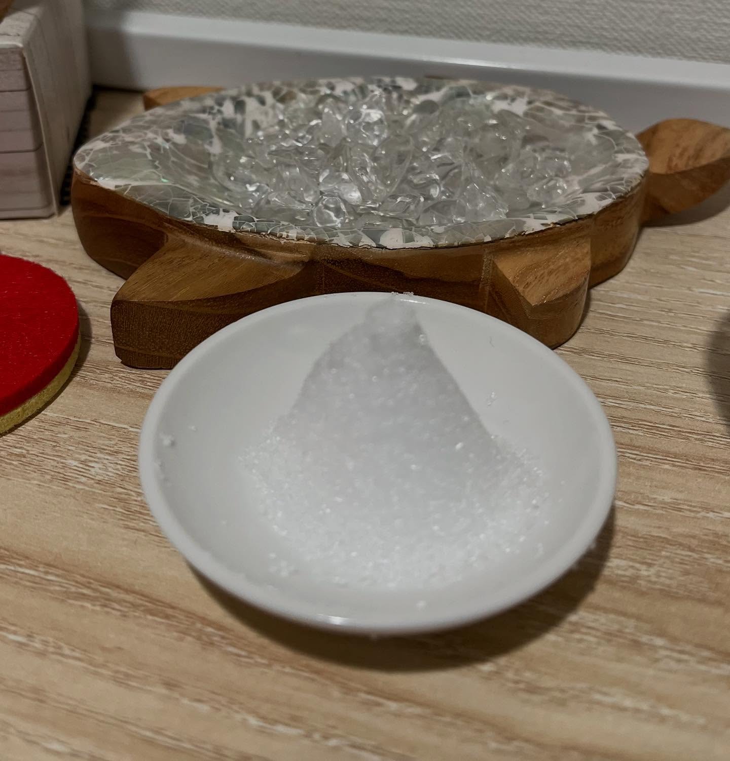 さっそく置く場所を掃除してちょっと下手くそだけどなんとか盛り塩できたよ✨